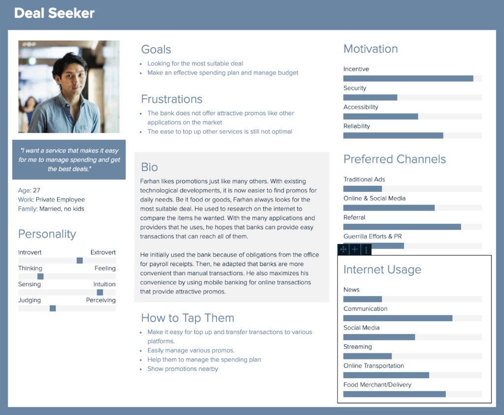The user research looks at the current Digital Banking landscape and people’s experience in using financial providers. The method used to get the data are Desk Research, User Interview, and Survey.